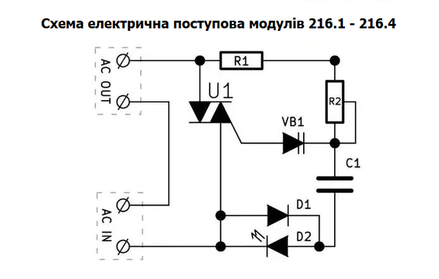 Радіоконструктор K216.1 складається з симістора і ланцюжка, що час задає. Принцип регулювання потужності полягає у зміні тривалості часу відкритого стану симістора. Чим більший час симістор відкритий, тим більша потужність віддається навантаження. А оскільки симістор вимикається в момент коли струм, що протікає через симістор, дорівнює нулю, то задаватимемо тривалість відкриття симістора в межах половини періоду. На початку позитивного напівперіоду симістор закритий. У міру збільшення напруги мережі, конденсатор С1 заряджається через дільник R1, R2. Заряд конденсатора триває до того часу, поки напруга у ньому досягне порога «пробою» диністора (близько 32 В). Диністор замкне ланцюг D1, C1, D2 і відкриє симістор U1. Симістор залишається відкритим до кінця напівперіоду. Час зарядки конденсатора визначається параметрами ланцюжка R1, R2, C1.